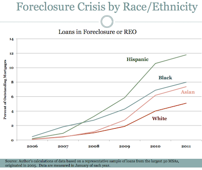 About half of all mortgages for blacks and Hispanics are subprime, versus roughly one-sixth for whites. Not surprisingly, the biggest home price collapses have occurred in heavily Hispanic cities such as Las Vegas, Miami, Phoenix, and Los Angeles.